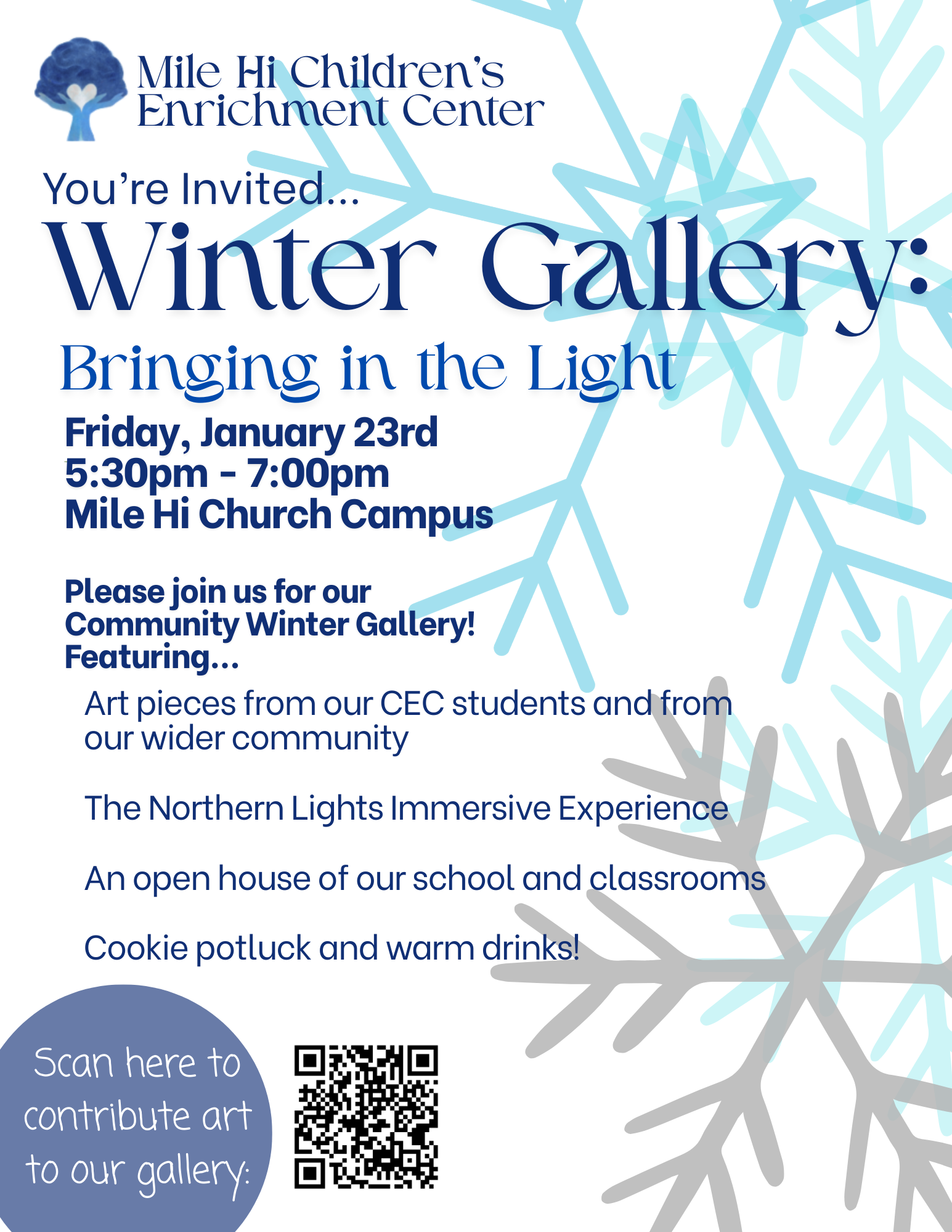 Mile Hi Children's Enrichment Center will be having a Winter Gallery on Friday, January 23rd, 5:30pm-7:30pm. This will be open to the public and our local community of preschools, elementary schools and neighbors! We invite children, parents, educators, and community members to come experience our school, our curriculum, an Immersive Northern Lights Experience, and a Gallery of art pieces from our school community and our wider community.